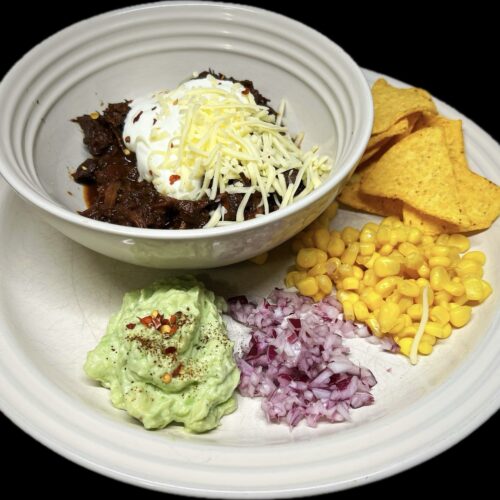 - Servera slutligen din Texas No Bean Chili med gräddfil och ex.vis nachos, jalapeños, guacamole, riven cheddarost, rödlök & majs.